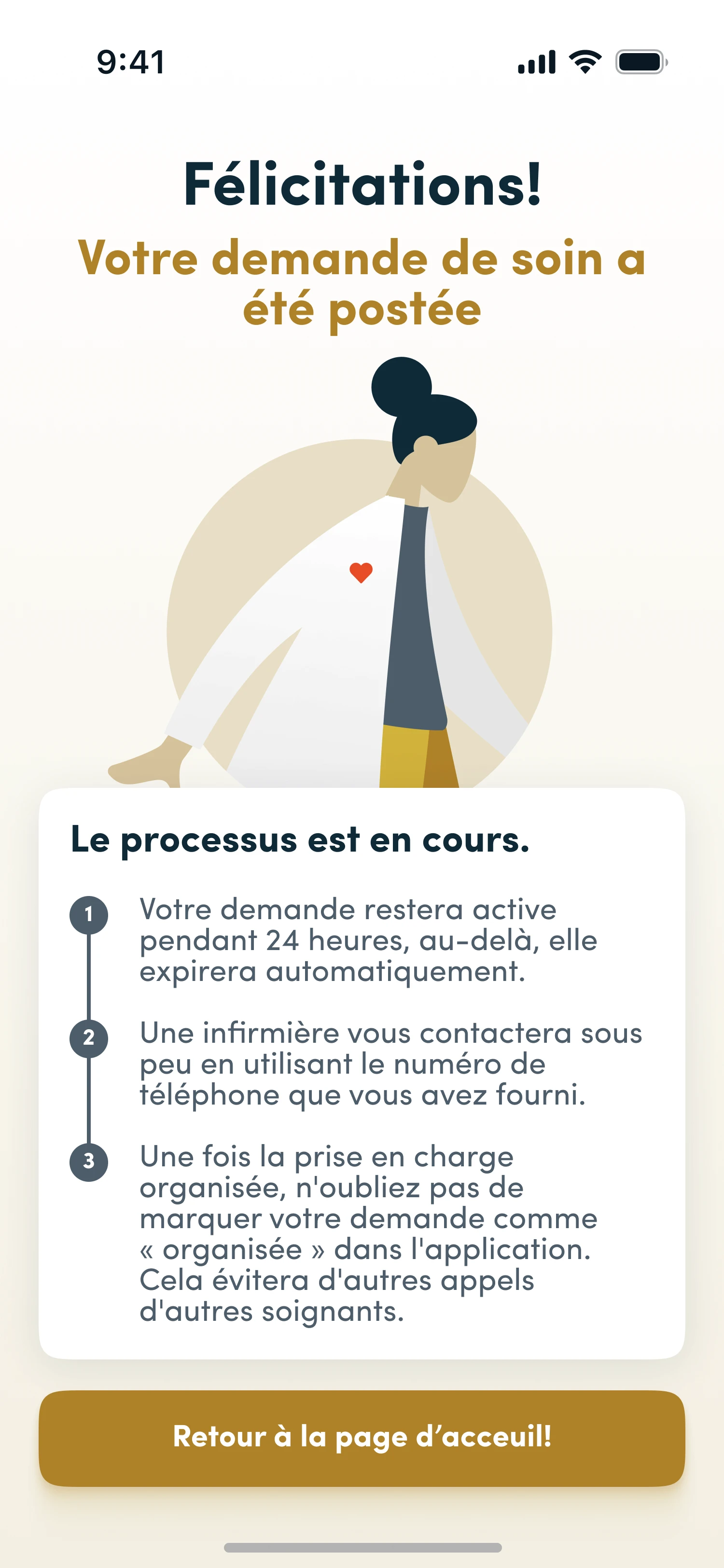 Une infirmière vous contactera directement afin de plaifier vos soins, pour que vous puissiez recevoir le soutien dont vous avez besoin et ce dans les meilleurs délais.